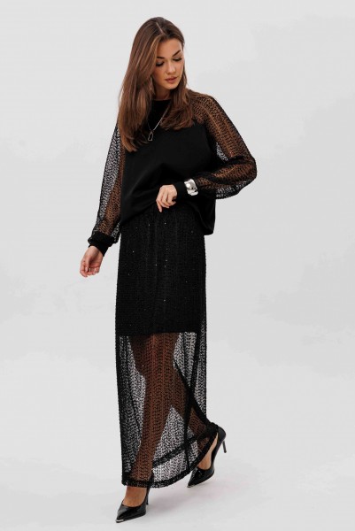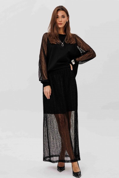 Юбка макси гармонично поддерживает дизайн: плотная внутренняя часть обеспечивает комфорт и уверенность, а длинная прозрачная нижняя вставка из мерцающей сетки добавляет загадочности и женственности. Комплект смотрится нарядно, но остаётся практичным — идеален как для вечерних выходов, так и для особых событий, где хочется выглядеть эффектно, но без излишнего пафоса.