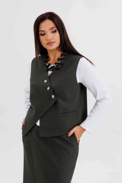 Стильный женский костюм в полоску — идеальное сочетание элегантности и современного минимализма. Комплект состоит из жилета оригинального кроя с асимметричной застёжкой, прямой юбки миди с мягким запахом и джемпера с длинным рукавом.
