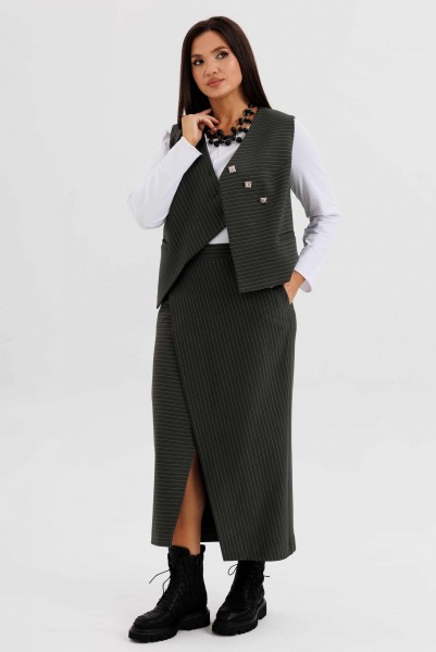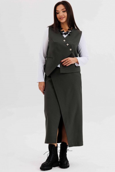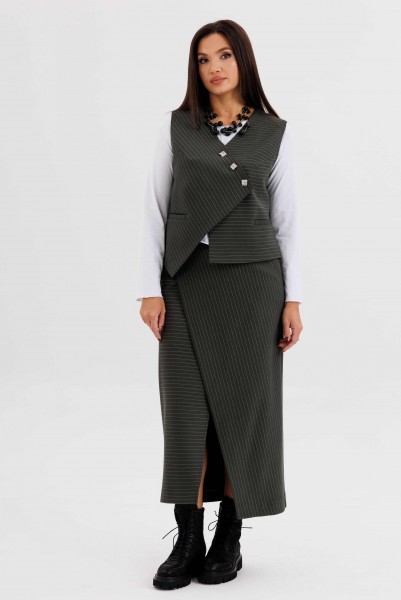Модель выполнена из плотной трикотажной ткани с тонкой вертикальной полоской, которая визуально вытягивает силуэт и подчёркивает стройность. Жилет без рукавов застёгивается на декоративные пуговицы, создавая выразительный акцент в образе. Юбка миди с запахом добавляет женственности и комфорта при движении. Джемпер трикотажный, с длинным рукавом, полуприлегающего силуэта.