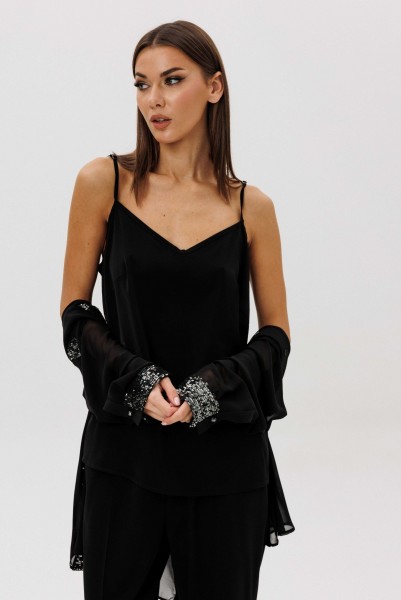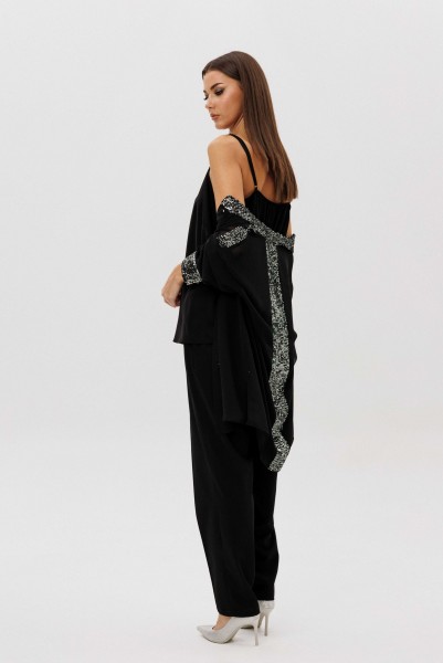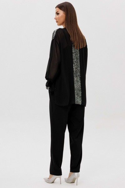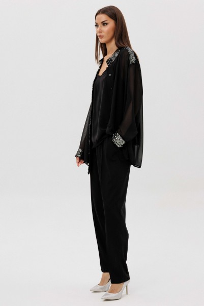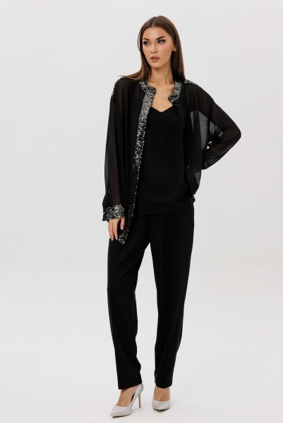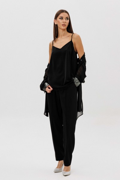 Лёгкая шифоновая блуза свободного покроя украшена изысканной отделкой пайетками по линии борта и манжетам, создавая тонкий блеск и игру света в движении. Атласный топ на регулируемых бретелях добавляет мягкого женственного сияния и комфортно садится по фигуре. Брюки из поливискозного полотна со стрелками и эластичным поясом завершают образ, сочетая удобство и безупречный силуэт.