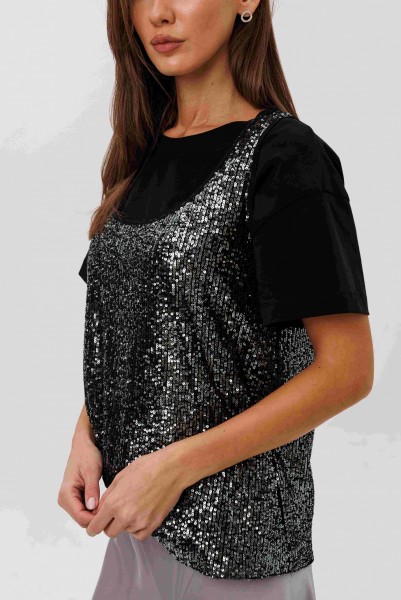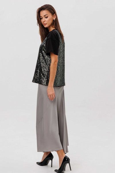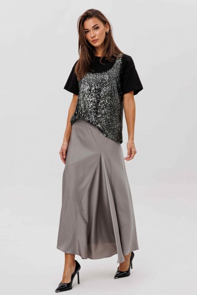 Тройка, созданная для выразительных и стильных образов. Эффектная юбка миди с асимметричными рельефами и конической вставкой из атласного полотна формирует красивую динамику в движении. Мягкая блуза-футболка из комфортного вискозного трикотажа дарит ощущение легкости и идеально балансирует сияние топа. Майка с пайетками добавляет образу яркость и праздничный акцент — носите ее как самостоятельный элемент или сочетайте со всей тройкой для максимального эффекта.