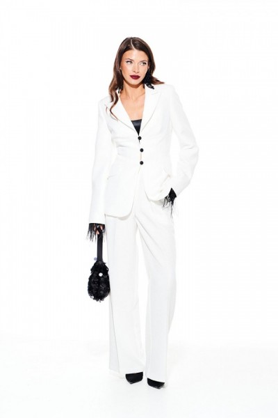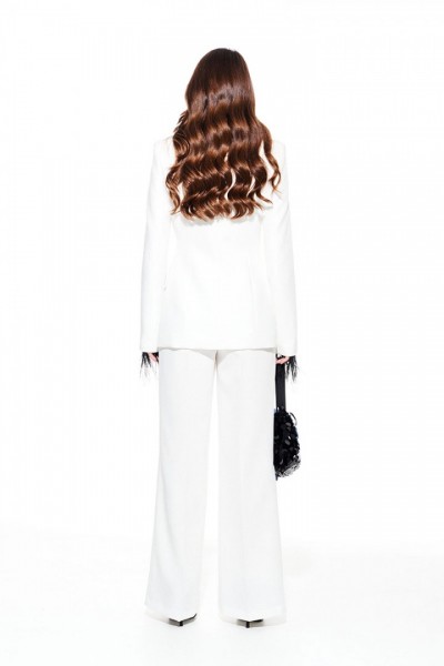 Жакет приталенного силуэта, с отложным воротником и лацканами пиджачного типа, с центральной застежкой на 3 навесные петли и 3 пуговицы, на подкладке. Перед отрезной, с рельефами, нагрудными вытачками, имитацией кармана с клапаном. Спинка со средним швом и рельефами. Рукав втачной, двухшовный, длинный. Низ рукава со съемной тесьмой из перьев.