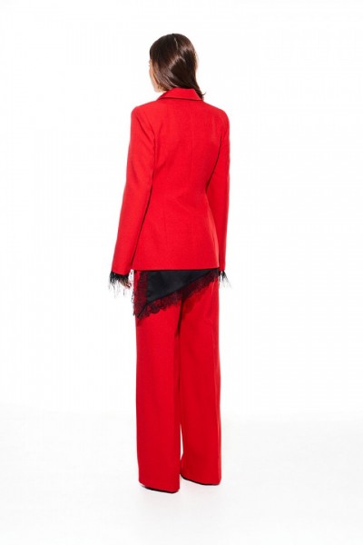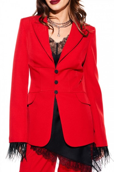 Жакет приталенного силуэта, с отложным воротником и лацканами пиджачного типа, с центральной застежкой на 3 навесные петли и 3 пуговицы, на подкладке. Перед отрезной, с рельефами, нагрудными вытачками, имитацией кармана с клапаном. Спинка со средним швом и рельефами. Рукав втачной, двухшовный, длинный. Низ рукава со съемной тесьмой из перьев.
