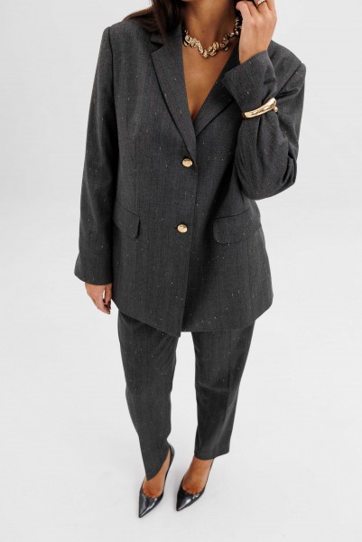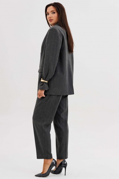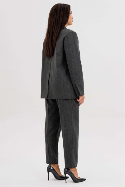 Жакет свободного расширенного силуэта, втачного покроя с центральной застёжкой и классическим английским воротником. Полочка с отрезным бочком, нагрудной вытачкой и прорезным карманом с клапаном. Спинка с центральным швом, шлицей и отрезным бочком. Рукав двухшовный с отлетной шлицей.