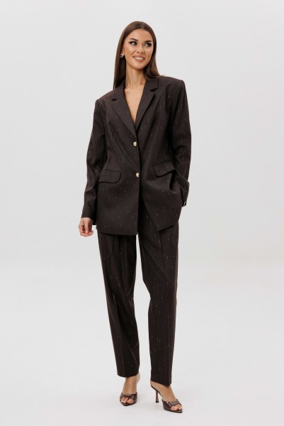 Жакет свободного расширенного силуэта, втачного покроя с центральной застёжкой и классическим английским воротником. Полочка с отрезным бочком, нагрудной вытачкой и прорезным карманом с клапаном. Спинка с центральным швом, шлицей и отрезным бочком. Рукав двухшовный с отлетной шлицей.