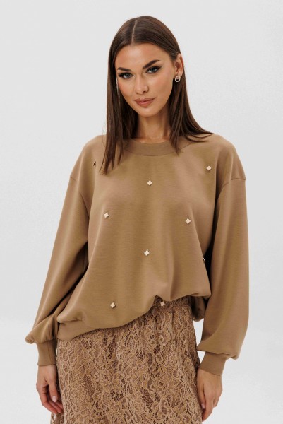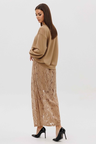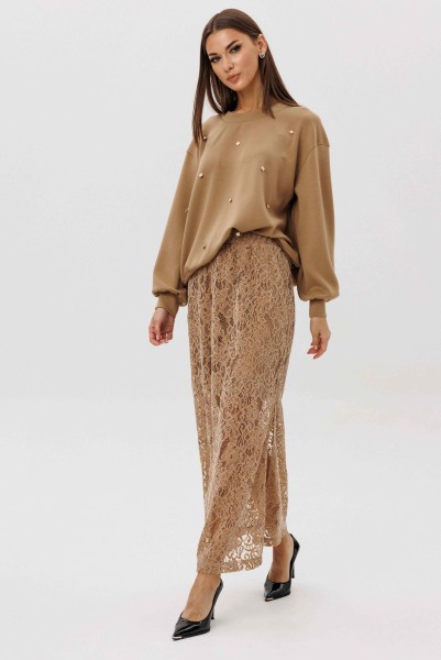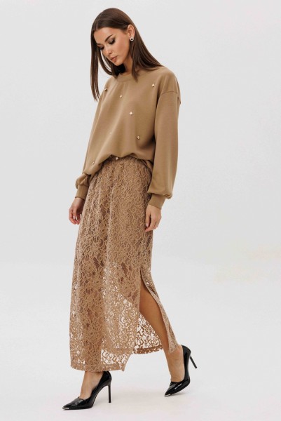 Стильный комплект, сочетающий уют и женственность. Мягкий свитшот из комфортного трикотажа украшен ручной расшивкой декоративными элементами в форме «клевера» — утончённая деталь, создающая акцент на естественной элегантности. Юбка выполнена из трендового шенилового гипюра с укороченной подкладкой, что придаёт образу лёгкость и современную многослойность.