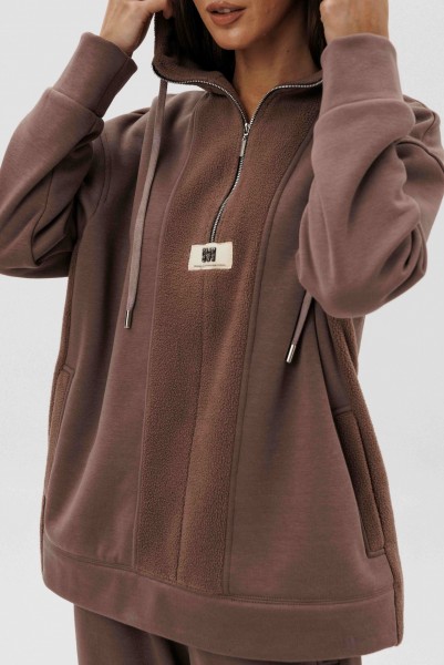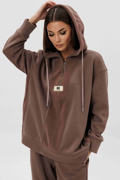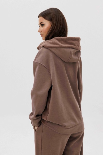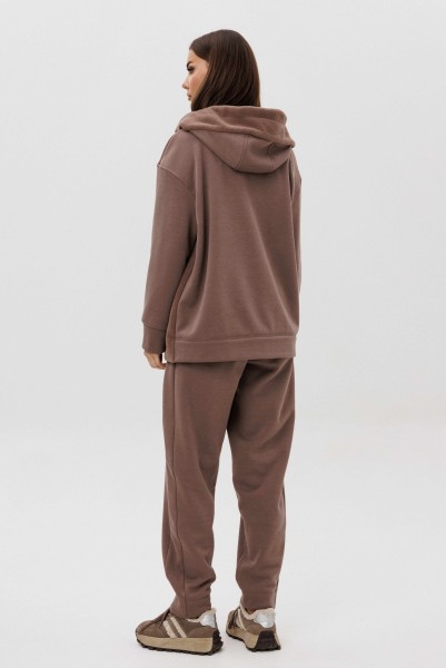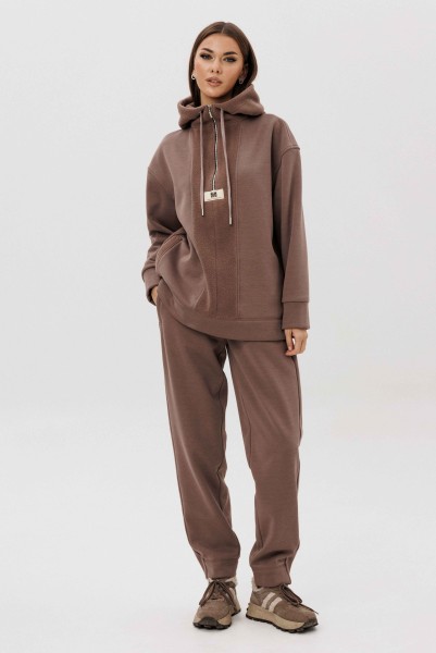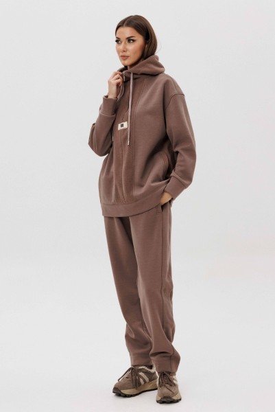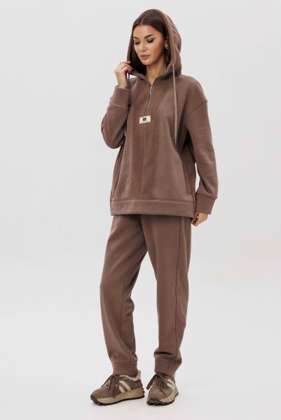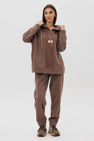 Уютный костюм из тёплого футера с мягким начёсом «барашек» — идеальный выбор для прохладного сезона. Толстовка свободного силуэта с объёмным капюшоном и функциональной молнией спереди создаёт стильный и комфортный образ. Акцентная отделка и фирменная нашивка добавляют современный штрих. Брюки прямого кроя с эластичным поясом и манжетами обеспечивают удобную посадку и свободу движений.