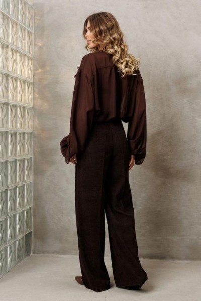 Брюки палаццо с притачным поясом из мягкой вельветовой ткани. Спереди застежка гульфик на молнии и петлей и пуговицей по поясу. По задней частям брюк вытачки. Пояс с резинкой в боковых частях. Брюки с заутюженными стрелками.