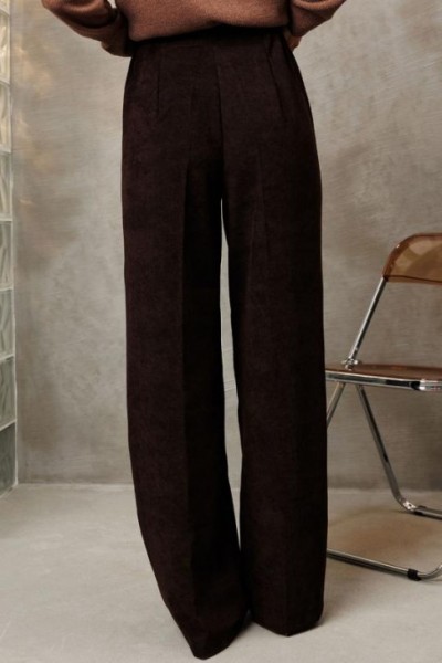 Брюки палаццо с притачным поясом из мягкой вельветовой ткани. Спереди застежка гульфик на молнии и петлей и пуговицей по поясу. По задней частям брюк вытачки. Пояс с резинкой в боковых частях. Брюки с заутюженными стрелками.