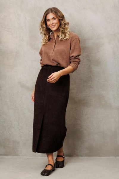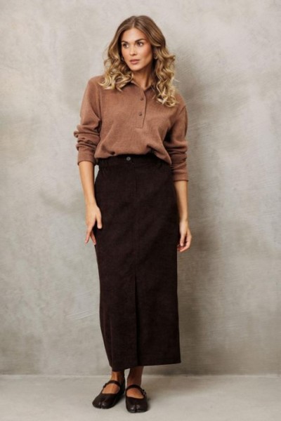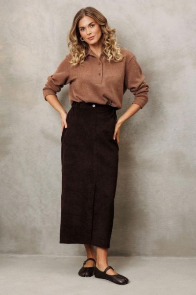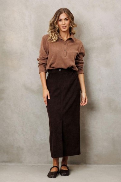 Юбка прямого силуэта выполненная из мягкой вельветовой ткани. Передняя честь юбки с вытачками, со средним швом и застежкой гульфиком на молнии и щлицей спереди. Задняя часть юбки с вытачками. Юбка на притачном поясе с затежкой на петлю и пуговицу спереди и резинками по бокам. Юбка на подкладке.