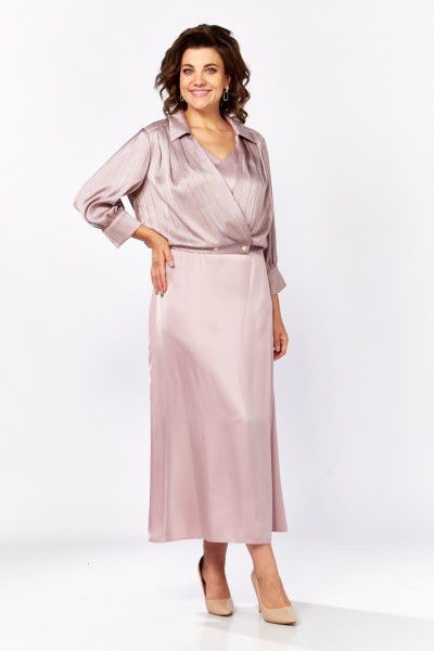Женский комплект, состоит из платья и блузы, выполнен из однотонного атласа и атласа в полоску. Платье с V-образной горловиной, на обтачке, по переду обработаны нагрудные вытачки. Спинка со средним швом и вытачками, рукав цельнокроеный, немного спущенный по линии плеча. Блуза свободного покроя, из атласа в полоску, по линии талии с притачным поясом из атласа в полоску. По спинке в пояс вставлена резинка для удобства регулировки на любой тип фигуры, горловина на обтачке, обработана воротником. Лиф платья с кокеткой по линии плеча, от линии кокетки заложены складки, по низу лиф присборен на пос. Спинка также свободного покроя, присборена по низу на пояс. Рукав втачной, длиной 3/4, по низу присборен на широкий манжет, на манжете застежка на петлю-пуговицу. Эффектный и стильный комплект выполненный в трендовых расцветках сделает ваш образ элегантным на любом мероприятии! Длина платья от плеча 128 см, длина блузки 51 см. Платье в 52р. Ширина груди- 106см, Ширина талии -102см, Ширина бедер- 120см.