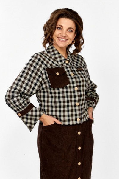 Женский комплект, состоит из жакета и юбки. Жакет выполнен из текстильной ткани в клетку, в качестве отделки штрукс. Горловина обработана воротником со стойкой, застежка по переду на пуговицы. На полочке обработаны рельефы и кокетки, также на полочке обработан накладной карман с клапаном из штрукса по одной стороне, по второй нашивка. Спинка идентична полочке, рукав втачной, по низу с манжетой из штрукса и текстиля в клетку, застегивается на пуговицу. Юбка выполнена из штрукса, с застежкой по переду на планку с пуговицами. Верхний срез обработан притачным поясом, по переду обработаны вертикальный подрезы и карманы. Заднее полотнище юбки со средним швом и вытачками. Эффектный и стильный комплект для вашего осеннего образа! Длина блузки 50см, длина юбки 78см.В 52р Блузка: Ширина груди- 56см, Ширина талии -54см, ширина бедер -см, длина рукава- 58см, ширина рукава 20см.