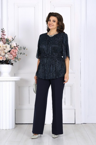 Этот костюм станет вашим универсальным решением: праздничный вечер, деловая встреча, торжественный ужин или новогодний приём — он уместен везде. Блузка с благородным мерцанием делает образ утончённым и эффектным, придавая нотку торжественности без излишнего блеска.