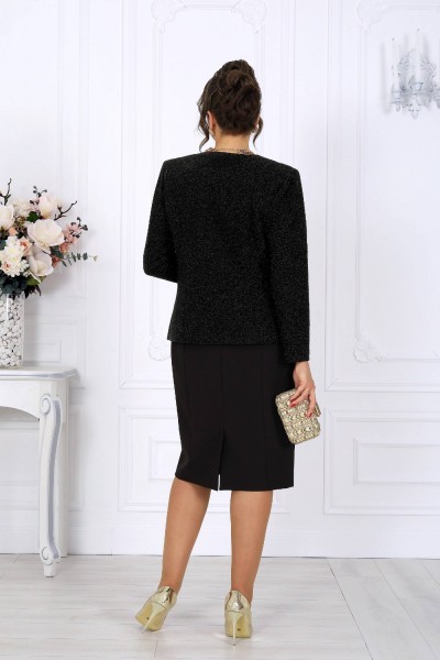 Жакет полуприлегающего силуэта, выполнен из трикотажного полотна с фактурной лицевой стороной «люрекс». Модель на трикотажной подкладке, с плечевыми накладками. Перед с нагрудными вытачками, направленными от проймы; спинка – с талиевыми. Фигурные борта фиксируются на запах по линии горловины при помощи внутренней застежки на 2 петли и 2 потайные пуговицы и внешней застежки - на 2 петли и 2 декоративные пуговицы, обтянутые основным материалом. Горловина округлой формой, спереди углубленная. Рукав втачной, длинный. Длина жакета – 62 см; длина рукава – 59 см.