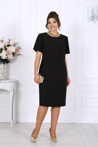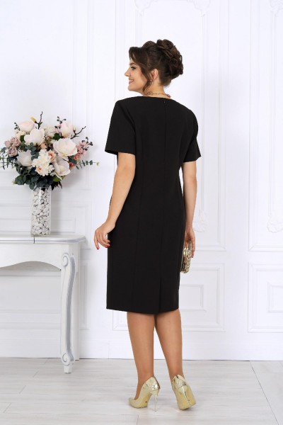 Платье полуприлегающего силуэта, выполнено из костюмно-плательной ткани. Модель на трикотажной подкладке, с плечевыми накладками. Перед и спинка с рельефными швами, направленными от проймы до низа. В верхней части среднего шва спинки обработана застежка на потайную тесьму-«молнию» (50см); в нижней части шва – шлица. Горловина округлой формы, спереди углубленная. Рукав втачной, короткий. Длина платья – 104 см; длина рукава – 25 см.