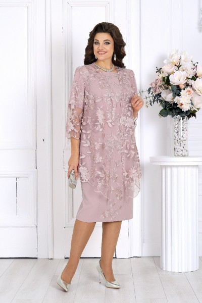 Платье женское, полуприлегающего силуэта, выполнено из костюмно-плательной ткани. Модель на подкладке, с плечевыми накладками. Перед с рельефными швами, направленными от горловины; центральная часть декорирована цветочной аппликацией, настроченной от горловины до низа. На спинке обработаны рельефные швы, направленные от горловины; в верхней части среднего шва спинки предусмотрена застежка на потайную тесьму-«молнию» (50 см), в нижней части – шлица. Вырез горловины округлый, углубленный по переду. Рукав короткий, втачной. Длина платья – 104 см, длина рукава – 25 см.