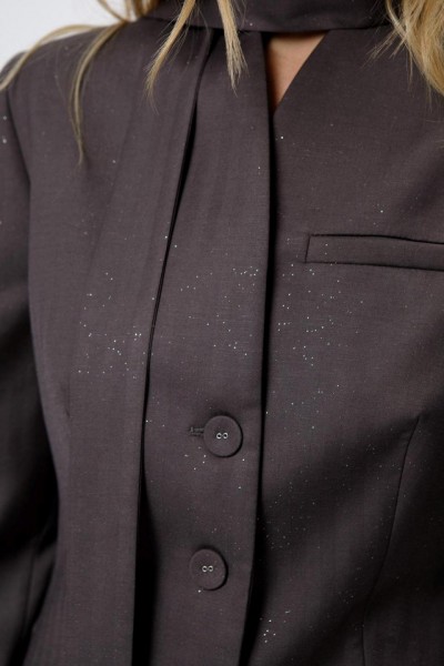 Костюм-двойка из приталенного жакета с акцентными плечами и укороченных классических брюк со стрелками.