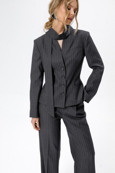 Костюм-двойка из приталенного жакета со съемным шарфиком и широких прямых брюк.