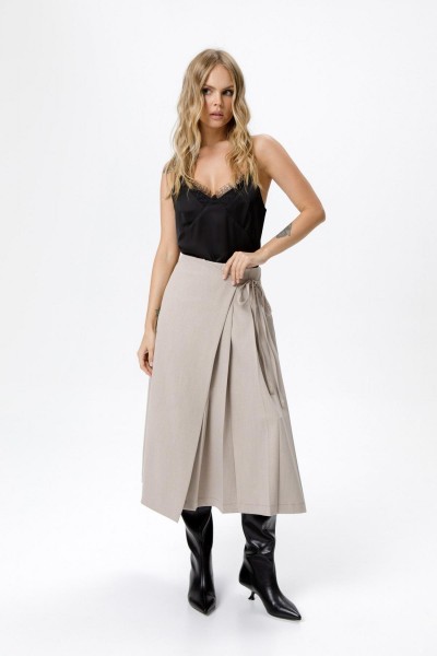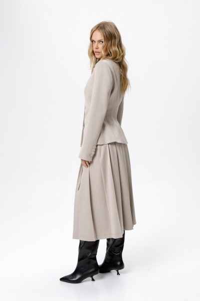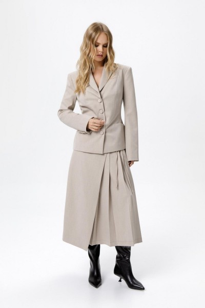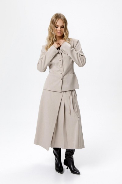 Костюм-двойка из укороченного приталенного жакета с акцентными карманами и асимметричной юбки со складками.