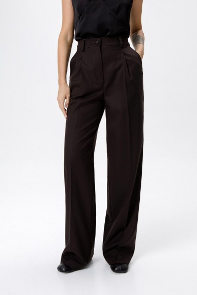 Классический костюм-двойка из приталенного жакета и прямых широких брюк со стрелками.