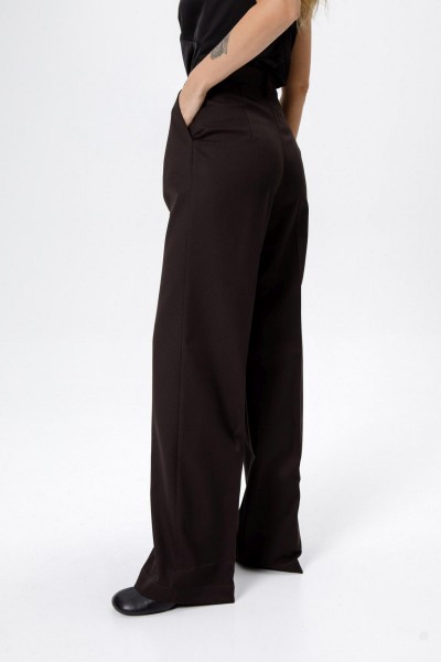 Детали: приталенный силуэт, пиджачный воротник, функциональные карманы, двубортная застежка на петли и пуговицы, спинка со средним швом, втачные двухшовные рукава, жакет на подкладке. Брюки с высокой посадкой на притачном поясе со шлевками, передние половины с небольшими застроченными мягкими складками и заутюженными стрелками, застежка на молнию и пуговицу, боковые карманы.