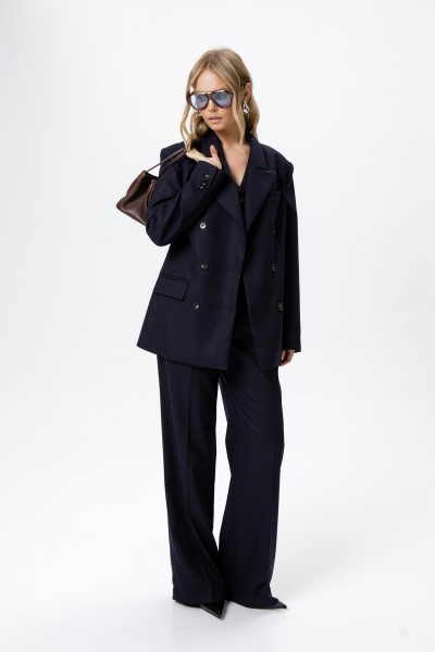 Детали: жакет свободного покроя и полуприлегающего силуэта, двубортная застежка на петли и пуговицы, отрезные бочки, пиджачный воротник, функциональные карманы, жакет на подкладке. Жилет полуприлегающего силуэта, талиевые вытачки, застежка на петли и пуговицы, функциональные карманы, фигурный низ, на подкладке. Брюки с высокой посадкой, притачной пояс со шлевками, передние половины с небольшими застроченными мягкими складками и заутюженными стрелками, застежка на молнию и пуговицу, боковые карманы. Задние части брюк с вытачками и заутюженными стрелками. Пояс брюк прямой, без резинки.