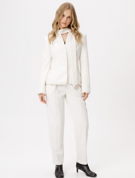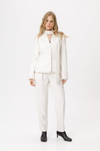 Костюм-двойка из приталенного жакета со съемным шарфиком и укороченных классических брюк со стрелками из фактурной ткани «букле».