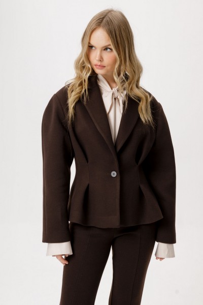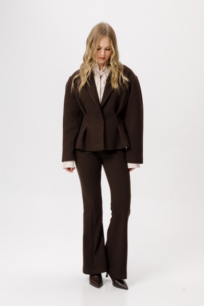 Костюм-двойка из приталенного жакета о-образного силуэта и облегающих брюк-клеш из утепленного трикотажа.