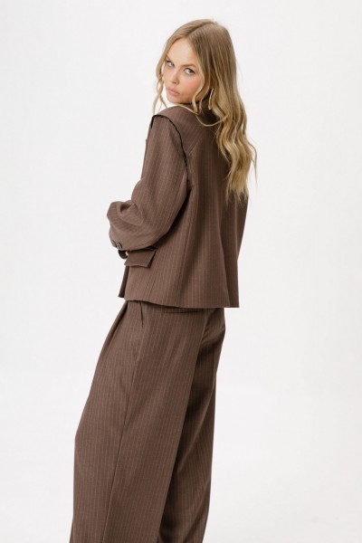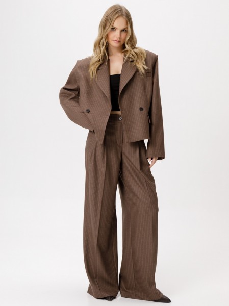 Костюм-двойка из укороченного оверсайз жакета с необработанным краем пройм и широких брюк-палаццо из текстильной ткани в полоску.
