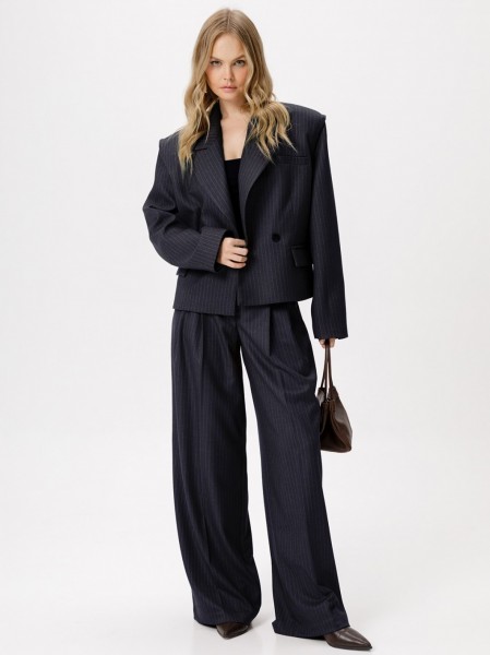 Костюм-двойка из укороченного оверсайз жакета с необработанным краем пройм и широких брюк-палаццо из текстильной ткани в полоску.