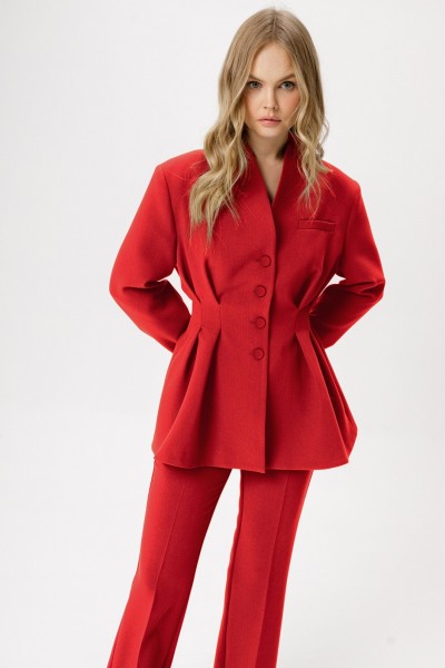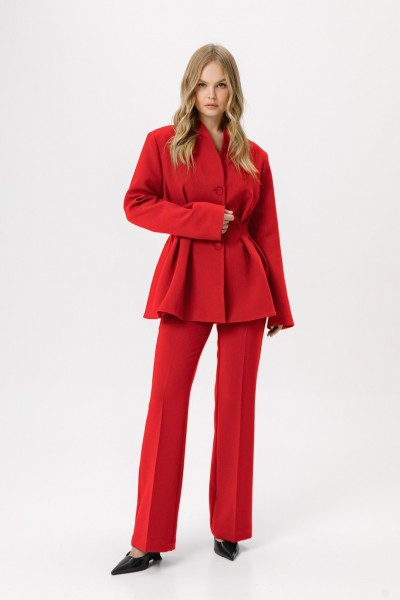 Костюм-двойка из приталенного жакета со складками и брюк-клеш со стрелками.