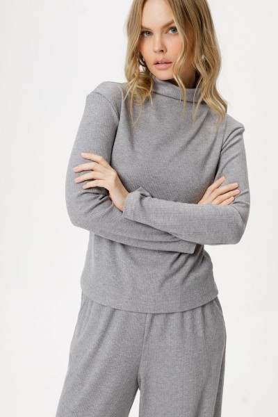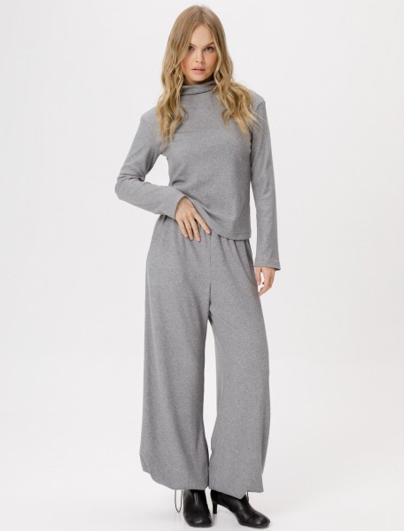 Трикотажный костюм-двойка из джемпера с цельнокроеной стойкой и широких брюк.