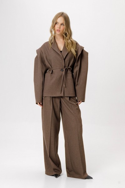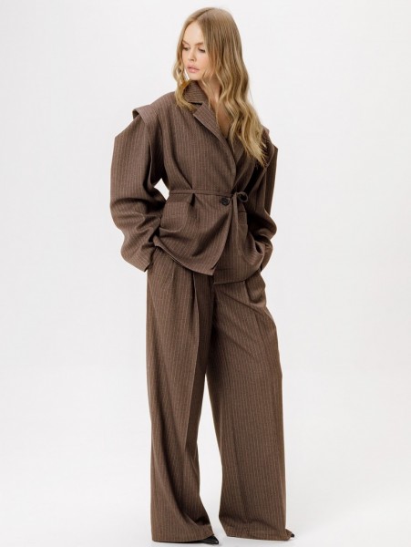 Костюм-двойка из оверсайз жакет со съёмным поясом и широких брюк-палаццо из текстильной ткани в полоску.