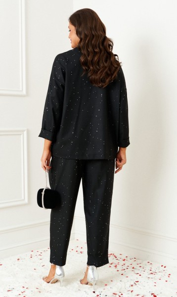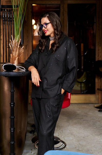 Костюм состоит из 2-х предметов одежды: рубашки и брюк. Выполнен из костюмной ткани стильного дизайна.