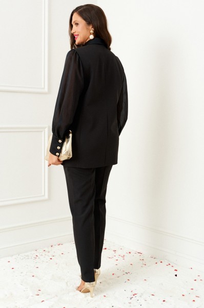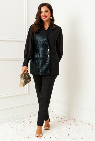 Комплект женский 3-ёх предметный: жилет, брюки, блузка. Выполнен из костюмно-смесового полотна с нежной фактурой, приятной на ощупь и матовой поверхностью в сочетании с отделочной тканью с бархатистой основой. Блузка представлена из респектабельной ткани «вуаль».