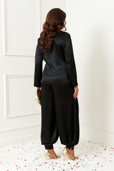 Костюм состоит из 2-х предметов одежды: жакета и брюк. Выполнен из атласной ткани стильного дизайна крэш.