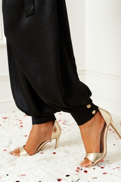 Брюки прямого силуэта, свободные вверху и со складками внизу, длиной до щиколотки, с двумя верхними боковыми карманами спереди.