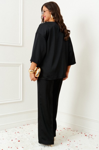 Изысканный костюм состоит из 2-ух предметов: блузки и брюк. Выполнен из атласного полотна в сочетании с кружевом. Основная ткань нежная, гладкой фактуры, приятная на ощупь и с блестящей поверхностью, она легко драпируется и очень выгодно и дорого подчёркивает образ; отделочная ткань придает праздничный шарм.
