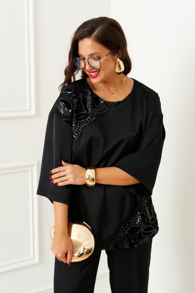 Блузка свободного силуэта, с удлиненной линией плеча, длиной до середины бедра.