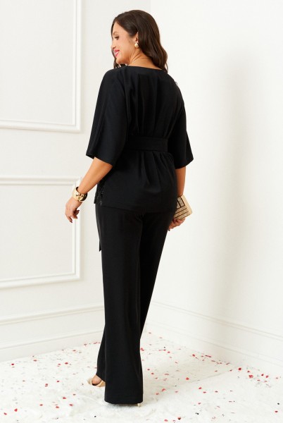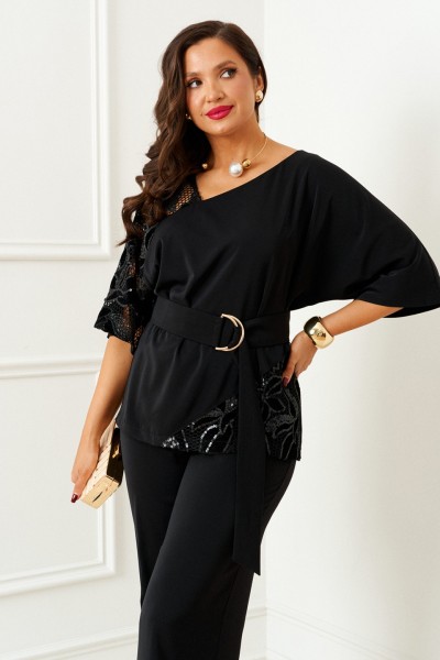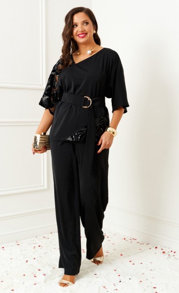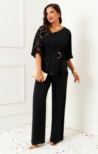 Изысканный костюм состоит из 2-ух предметов: блузки и брюк. Выполнен из эластичного полотна в сочетании с кружевом. Основная ткань нежная, гладко-бархатистой фактуры, приятная на ощупь, она легко драпируется и очень выгодно и дорого подчёркивает образ; отделочная ткань придает праздничный шарм.