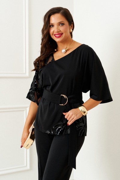 Блузка свободного силуэта, с удлиненной линией плеча, длиной до середины бедра.