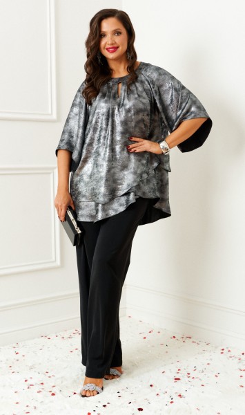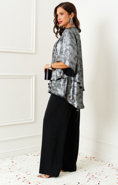 Изысканный костюм состоит из 2-ух предметов: блузки и брюк. Выполнен из эластичного полотна в сочетании с ворсовым шифоном. Брючная ткань нежная, гладко-бархатистой фактуры, приятная на ощупь, она легко драпируется и очень выгодно и дорого подчёркивает образ; блузочная ткань придает праздничный шарм.