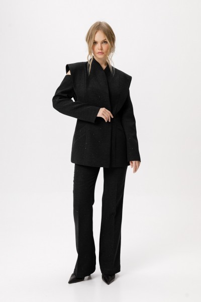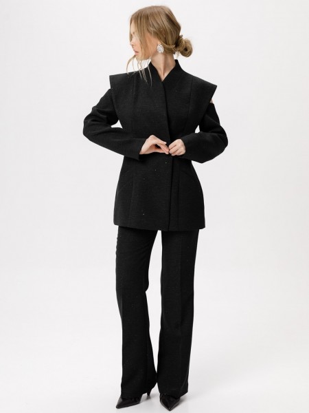Детали: полуприлегающий силуэт, цельнокроеный воротник-стойка, двубортная застёжка на петли и пуговицы, рельефные швы переда и спинки с декоративным элементом, рукава длинные с вырезами по верху, функциональные карманы, жакет на подкладке. Брюки с притачным поясом со шлёвками, передние половинки с заутюженными стрелками, наклонные карманы, задние половинки с вытачками и заутюженными стрелками, застёжка на молнию и пуговицу с потайным крючком, пояс брюк прямой без резинки.