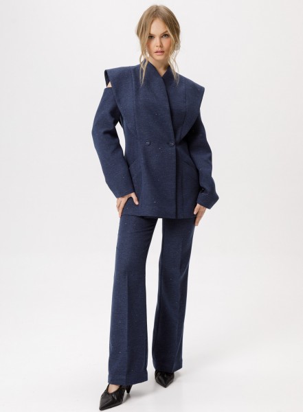 Детали: полуприлегающий силуэт, цельнокроеный воротник-стойка, двубортная застёжка на петли и пуговицы, рельефные швы переда и спинки с декоративным элементом, рукава длинные с вырезами по верху, функциональные карманы, жакет на подкладке. Брюки с притачным поясом со шлёвками, передние половинки с заутюженными стрелками, наклонные карманы, задние половинки с вытачками и заутюженными стрелками, застёжка на молнию и пуговицу с потайным крючком, пояс брюк прямой без резинки.