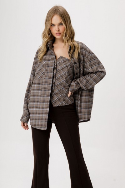 Комплект-тройка из текстильной оверсайз рубашки, топа-корсета в клетку и трикотажных облегающих брюк-клеш.