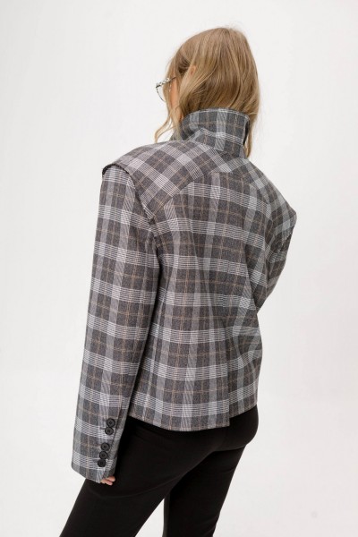 Комплект-двойка из укороченного оверсайз жакета в клетку с необработанными проймами и трикотажных облегающих брюк-клеш.