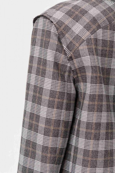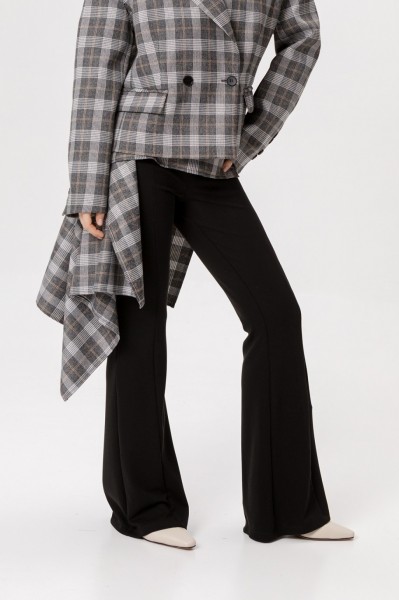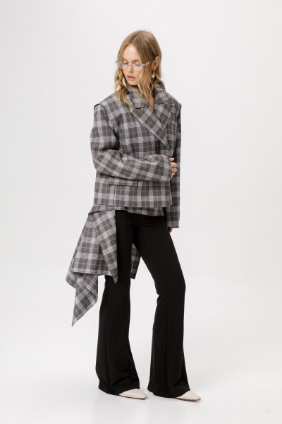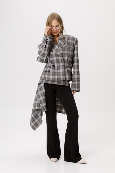 Комплект-тройка из укороченного оверсайз жакета в клетку с необработанными проймами, трикотажных облегающих брюк-клеш и юбки-баски килт.