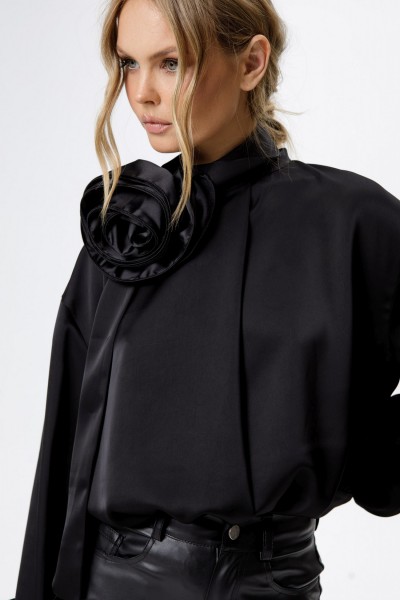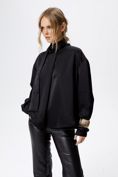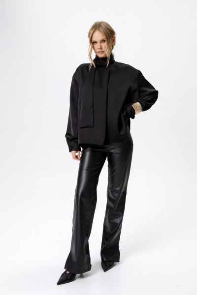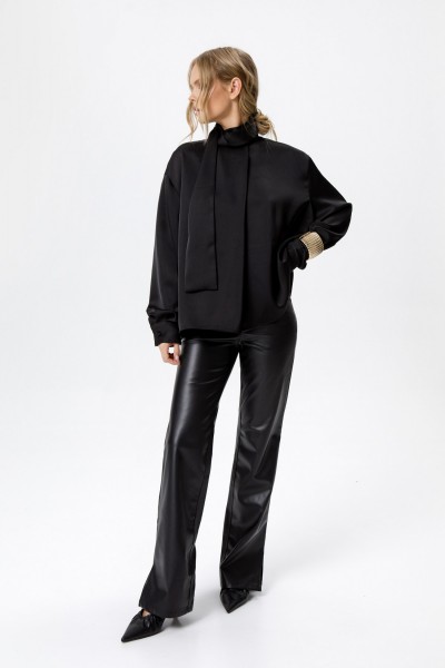Комплект-двойка из свободной блузы со стойкой-бантом и прямых брюк из экокожи.
