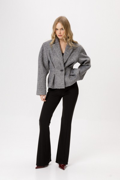 Комплект-двойка из приталенного жакета О-образного силуэта из утепленной фактурной ткани и трикотажных облегающих брюк-клеш.