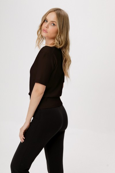 Детали: джемпер прямого силуэта с резинкой по низу, круглая грловина, рукава короткие. Брюки с высокой посадкой, перед с рельефными швами, пояс с резинкой, брюки без карманов.